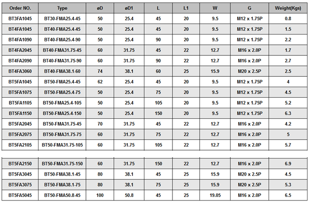 • Product description: BT/FMA FACE MILL ARBOR Draw Bar:BT30→M12 x 1.75P,BT40→M16 x 2.0P,BT50→M24 x 3.0P