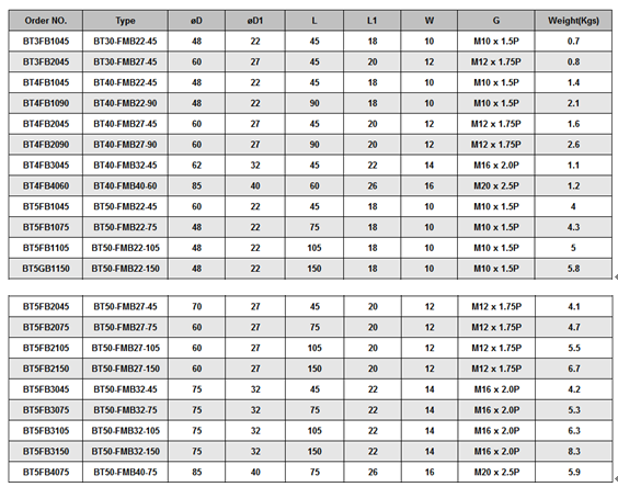 • Product description: BT/FMB FACE MILL ARBOR:BT30→M12 x 1.75P,BT40→M16 x 2.0P,BT50→M24 x 3.0P
